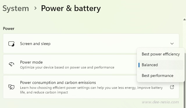 Untuk skema penggunaan dayanya, cukuplah pakai mode Balanced saja, ndak usah di Best Performance. Celeron N4020 – mau dipaksa setinggi apa?