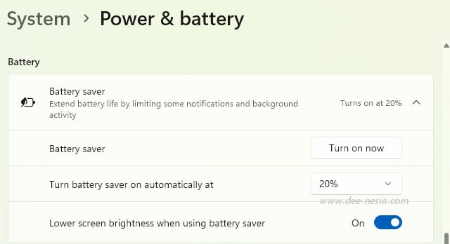 Jangan lupa, aktifkan juga Battery Saver-nya. Atur di kisaran 10 – 20%. Sehingga E410MA dan juga Anda punya cukup waktu memilih: cari charger dan melanjutkan bekerja atau menyimpan semua pekerjaan dan meyakinkan diri bahwa “esok akan lebih baik!” wkwkwk