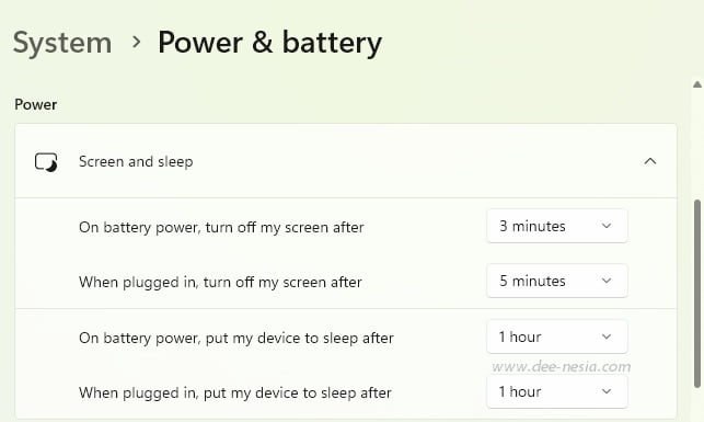 Kemudian pastikan si laptop boleh auto mematikan layar dan auto nge-sleep setelah waktu tertentu. Jangan di atur di Never…, lol