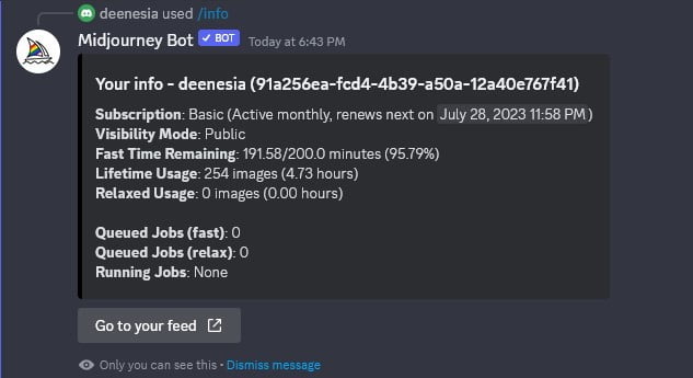 Seperti ini contoh hasil perintah /info dari akun MidJourney saya.