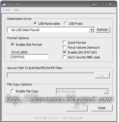 6. Eh, sekarang ada Dialog Box-nya program PeToUSB, wah sepertinya langkah install XP di netbook ini sudah di jalan yang benar.