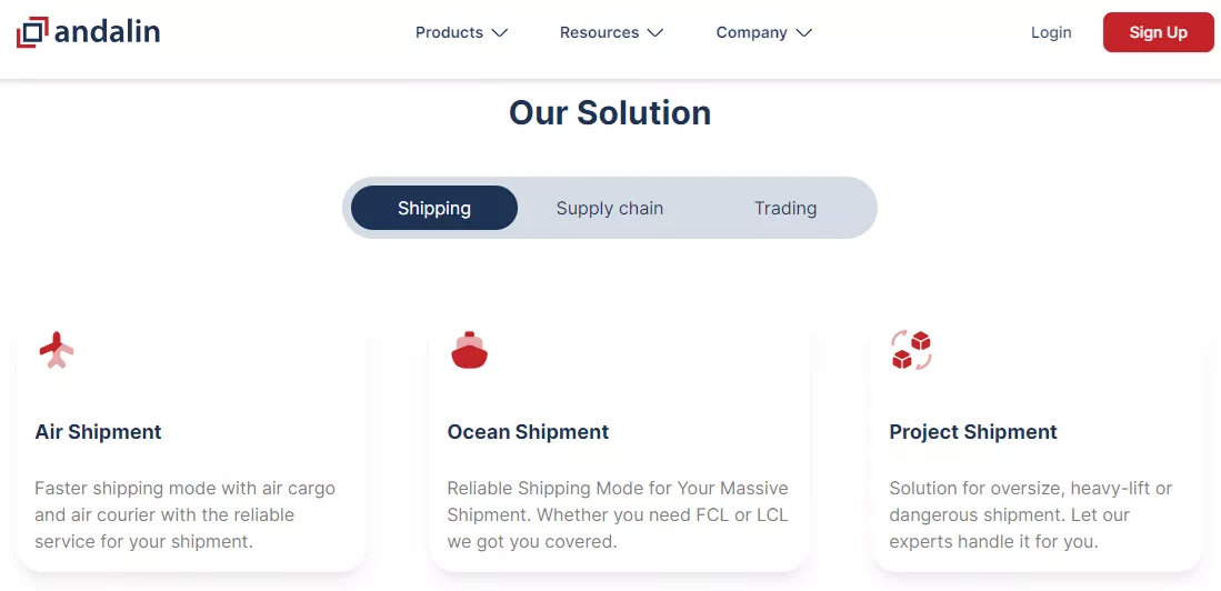 Dalam produk Andalin Shipping, terdapat 4 layanan unggulan, yaitu pengangkutan laut, pengangkutan udara, project shipment, dan Andalin GET yang merupakan layanan terbaru dari Andalin. Dengan Andalin GET para eksportir dapat dengan mudah mengatasi kelangkaan pengiriman laut jenis Full Container Load (FCL), dengan cara beralih ke jenis Less than Container Load (LCL).